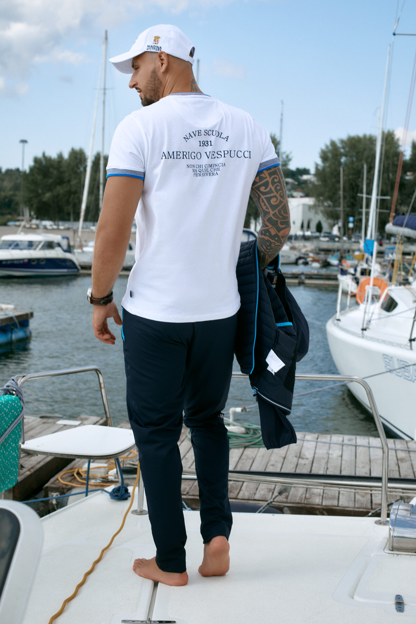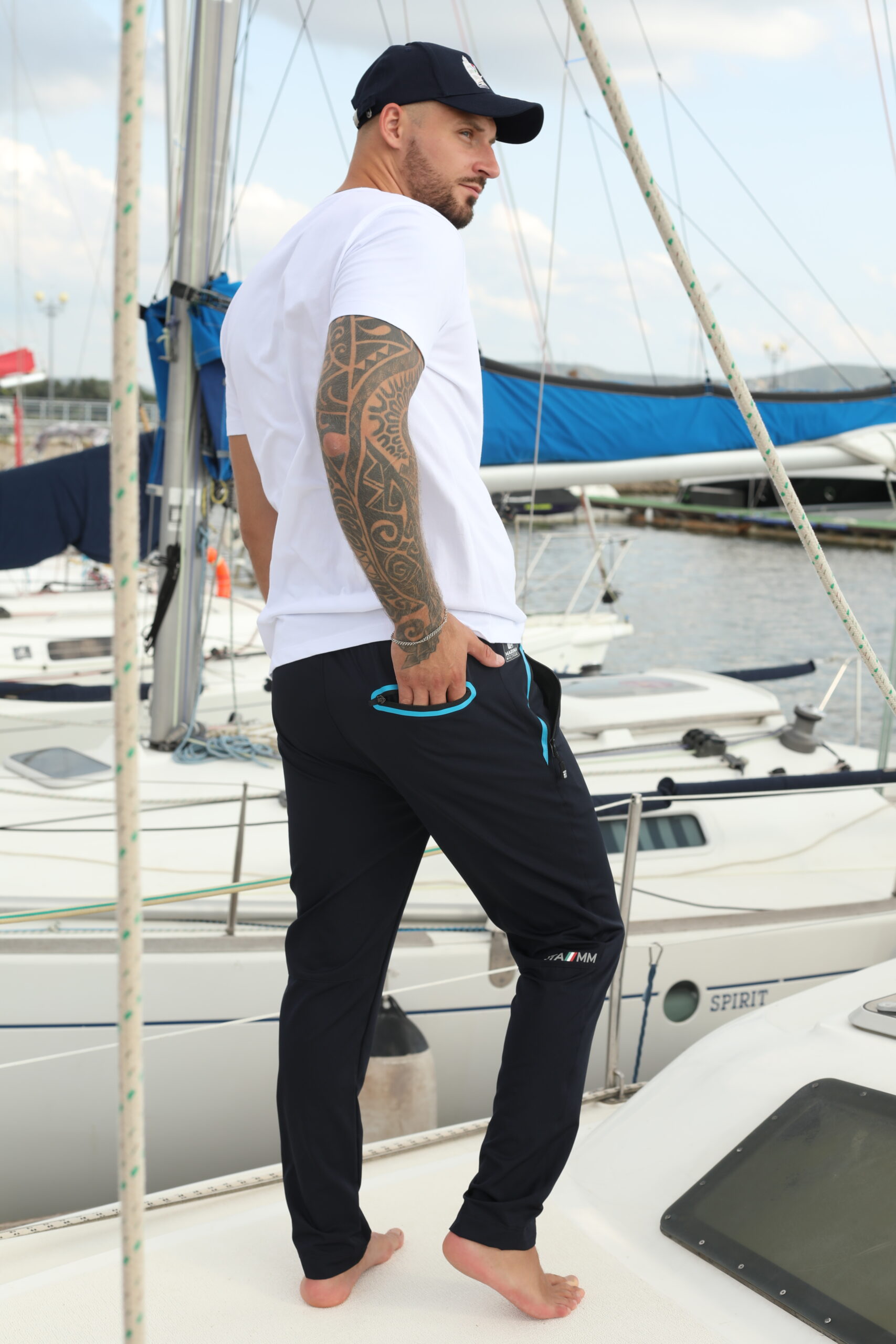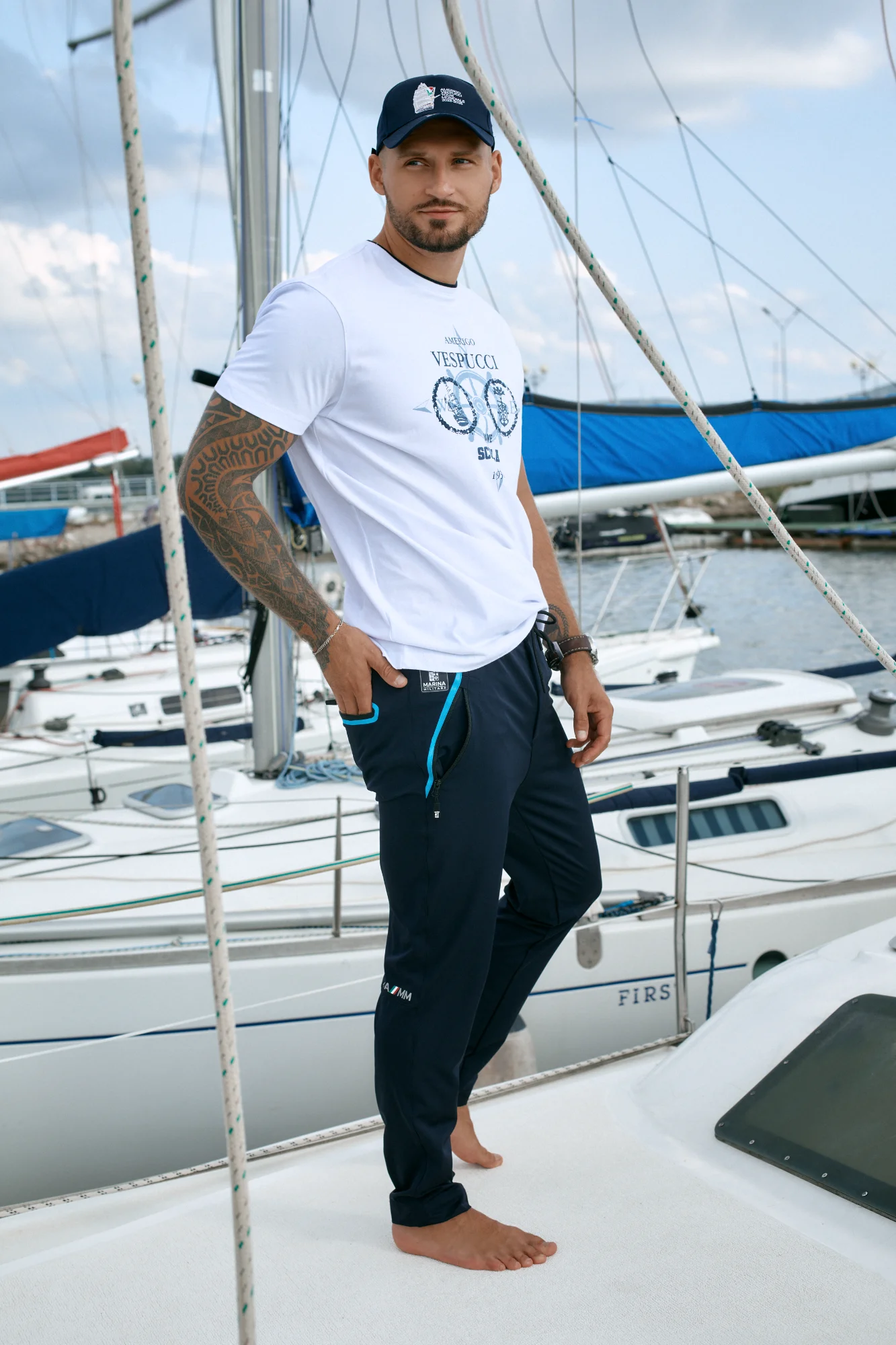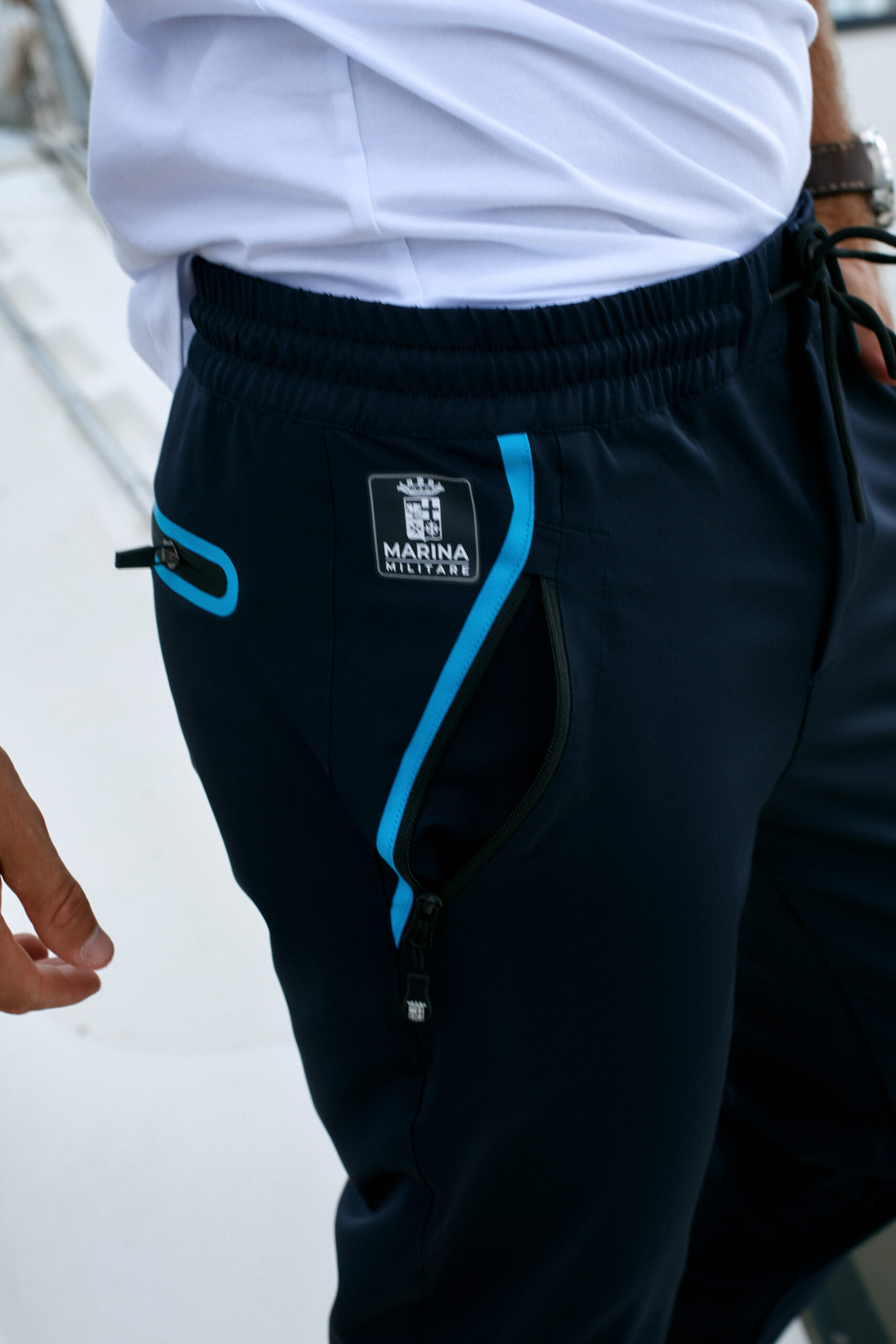 Спортивные брюки Marina Militare, талия на резинке со шнурком. Открытые прорезные карманы и карман на молнии сзади.