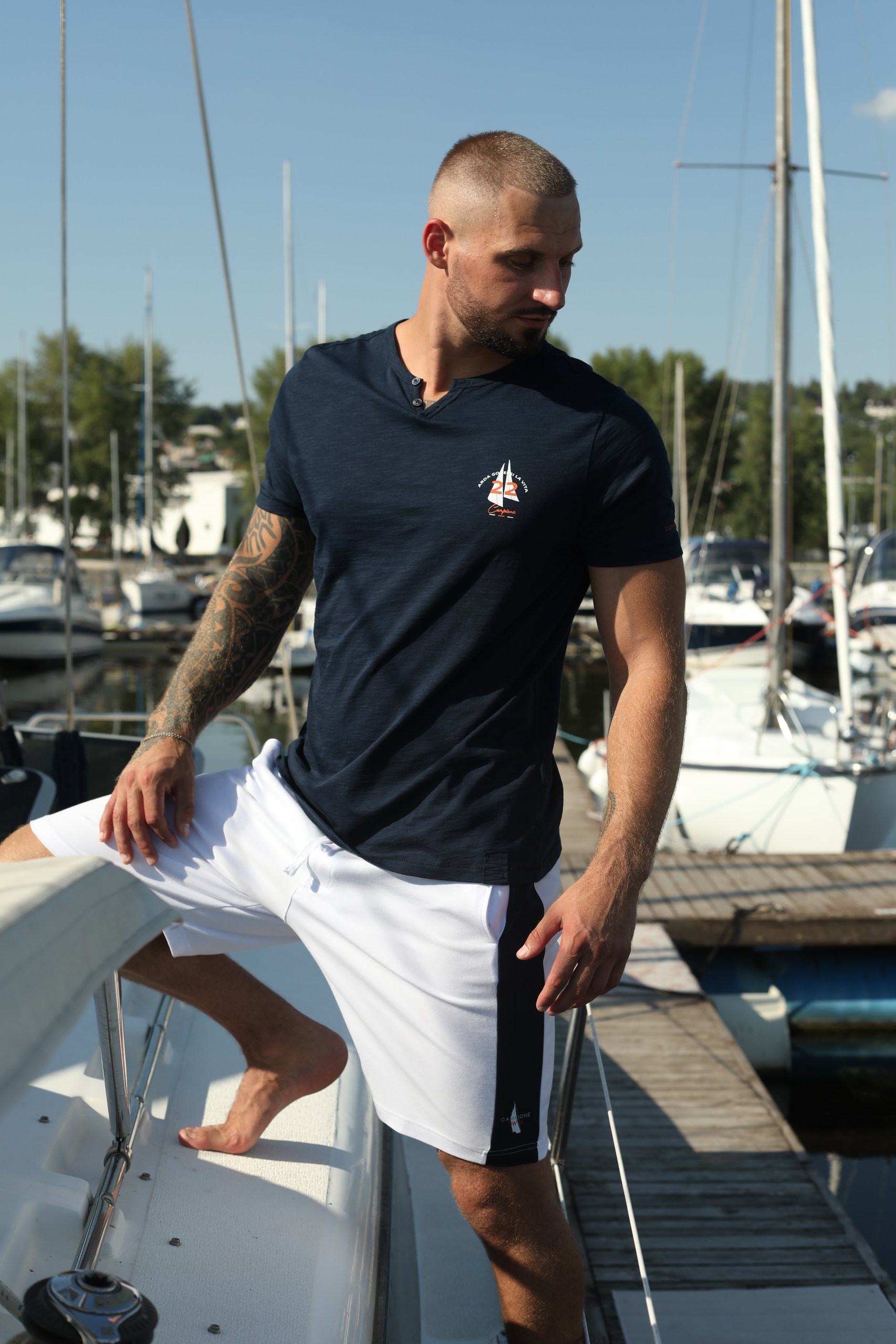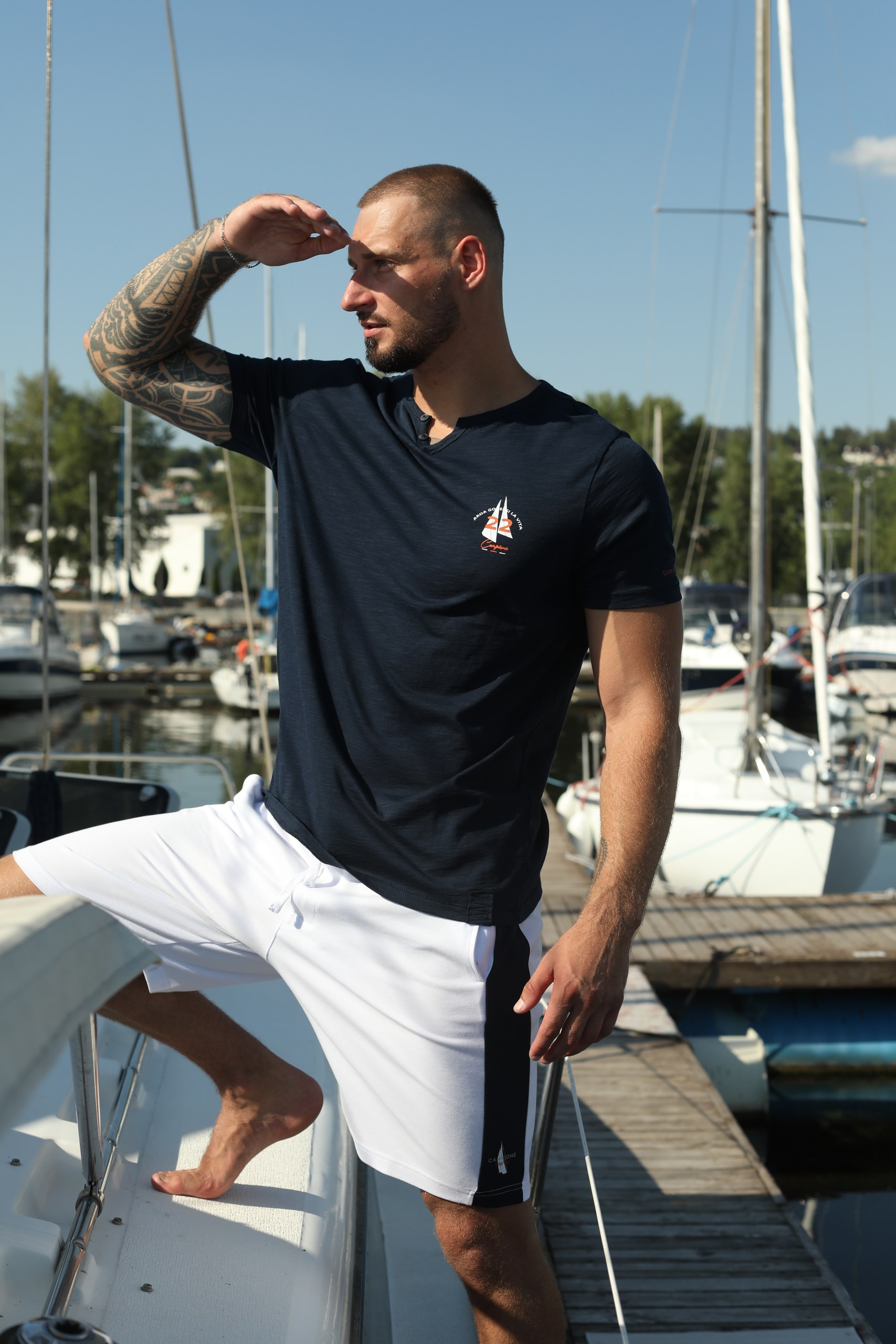 Синяя футболка Claudio Campione — отличный вариант для любителей морского стиля. Футболка изготовлена из 100% хлопка, обеспечивает комфорт и свободу ношения, идеально подходит для теплых дней, пляжа или повседневных прогулок. Прекрасно сочетается с джинсами и шортами.