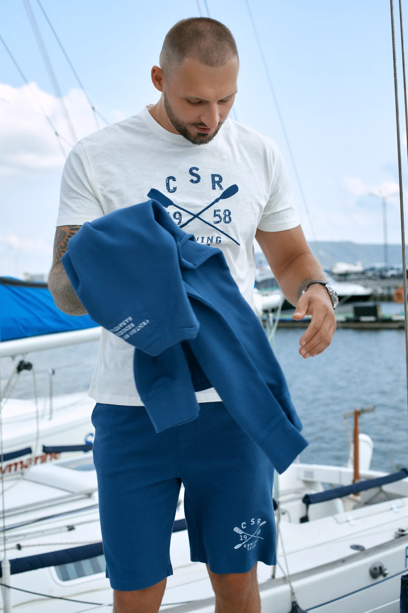 Футболка из хлопка с круглым вырезом и короткими рукавами. Вышивка на груди отсылает к новой линейке, посвященной и вдохновленной спортивной гребной группой Rowing Team-Sabaudia.