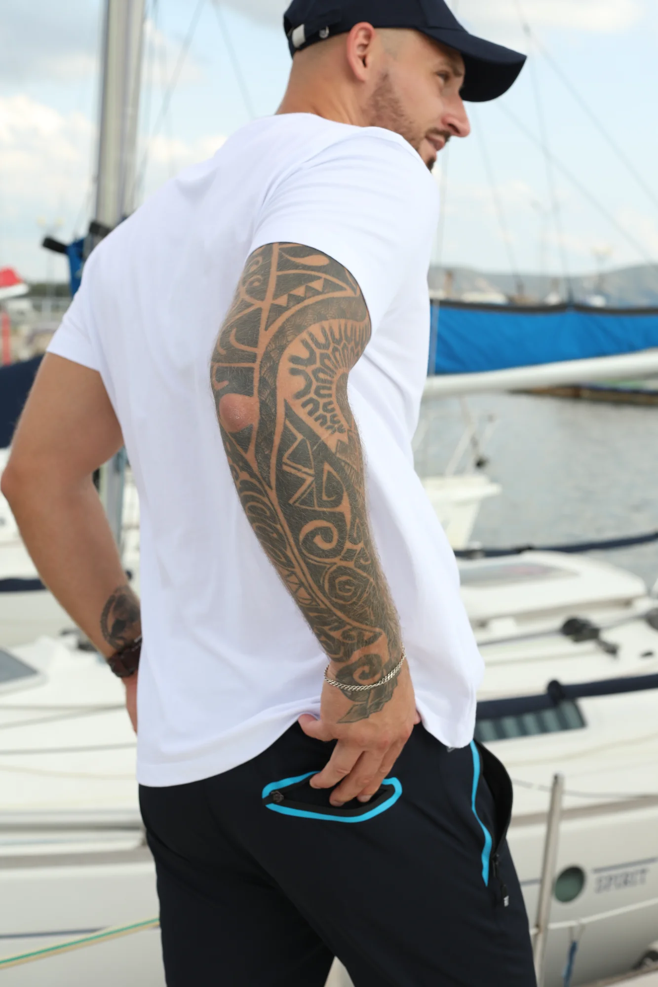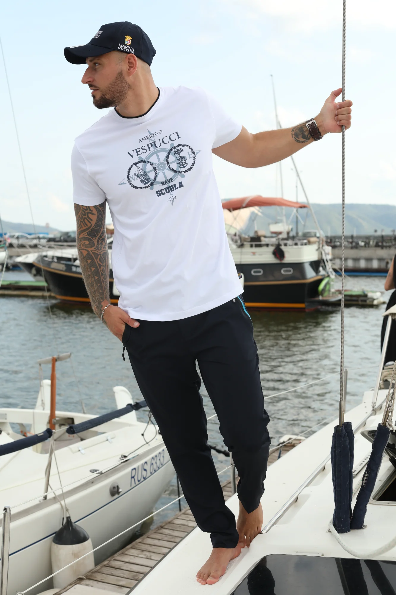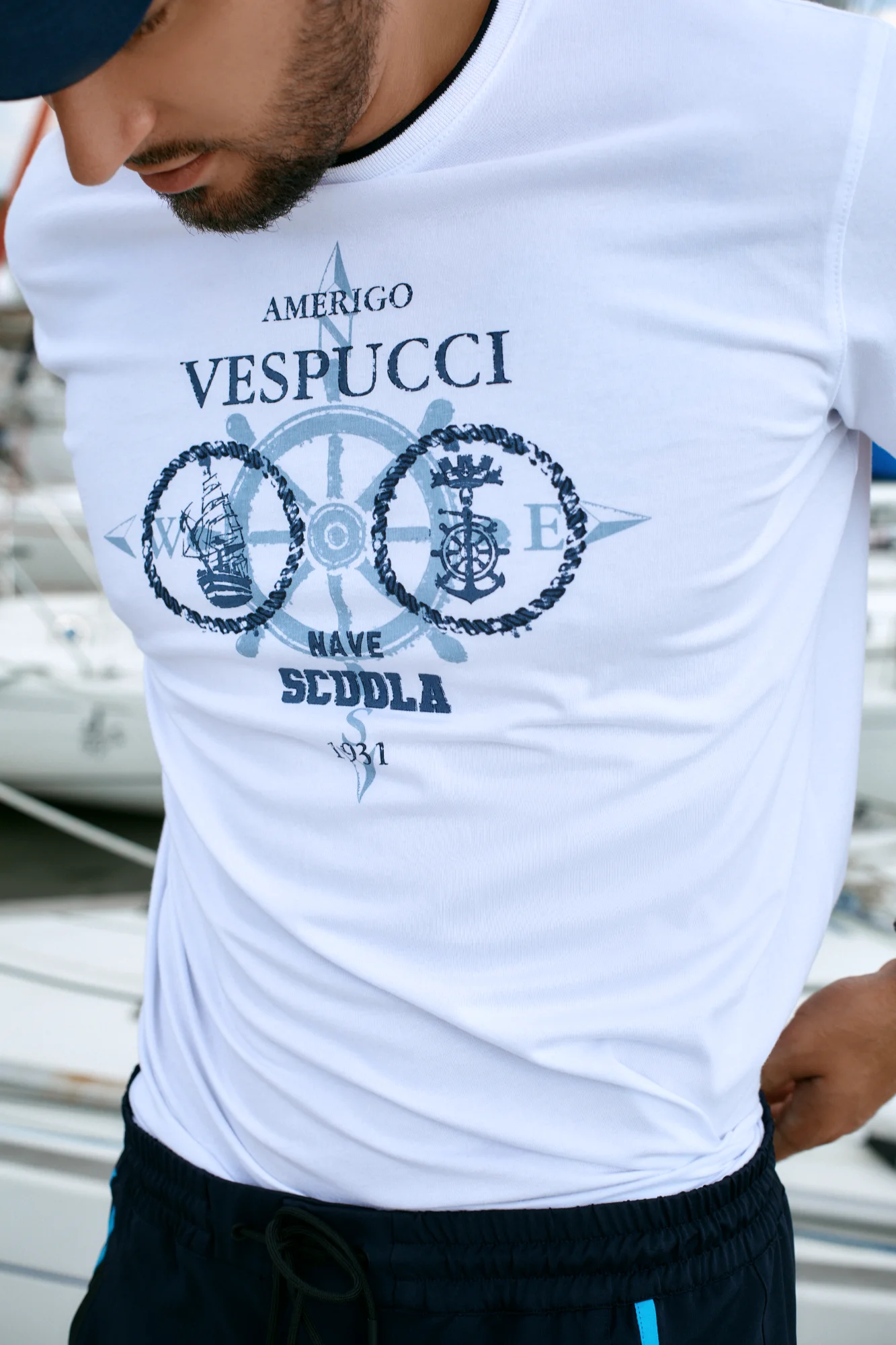 Футболка с двухцветным ребристым круглым вырезом. У футболки принт на груди с изображением, отсылающим к престижному учебному кораблю «Америго Веспуччи».