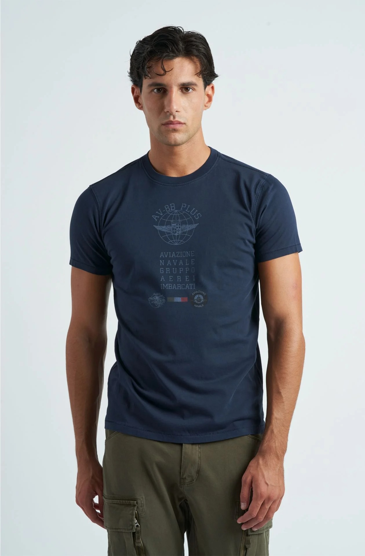 Хлопковая футболка Marina Militare с короткими рукавами и ребристым круглым вырезом. На передней части напечатана эмблема авиагруппы . На левом плече пришита многоцветная вышитая нашивка морской авиации. Изделие обработано специальной техникой окрашивания. Неравномерное выцветание и потеря цвета во время использования и стирки являются характерными особенностями, а не дефектами. Стирать отдельно и избегать прямых солнечных лучей.