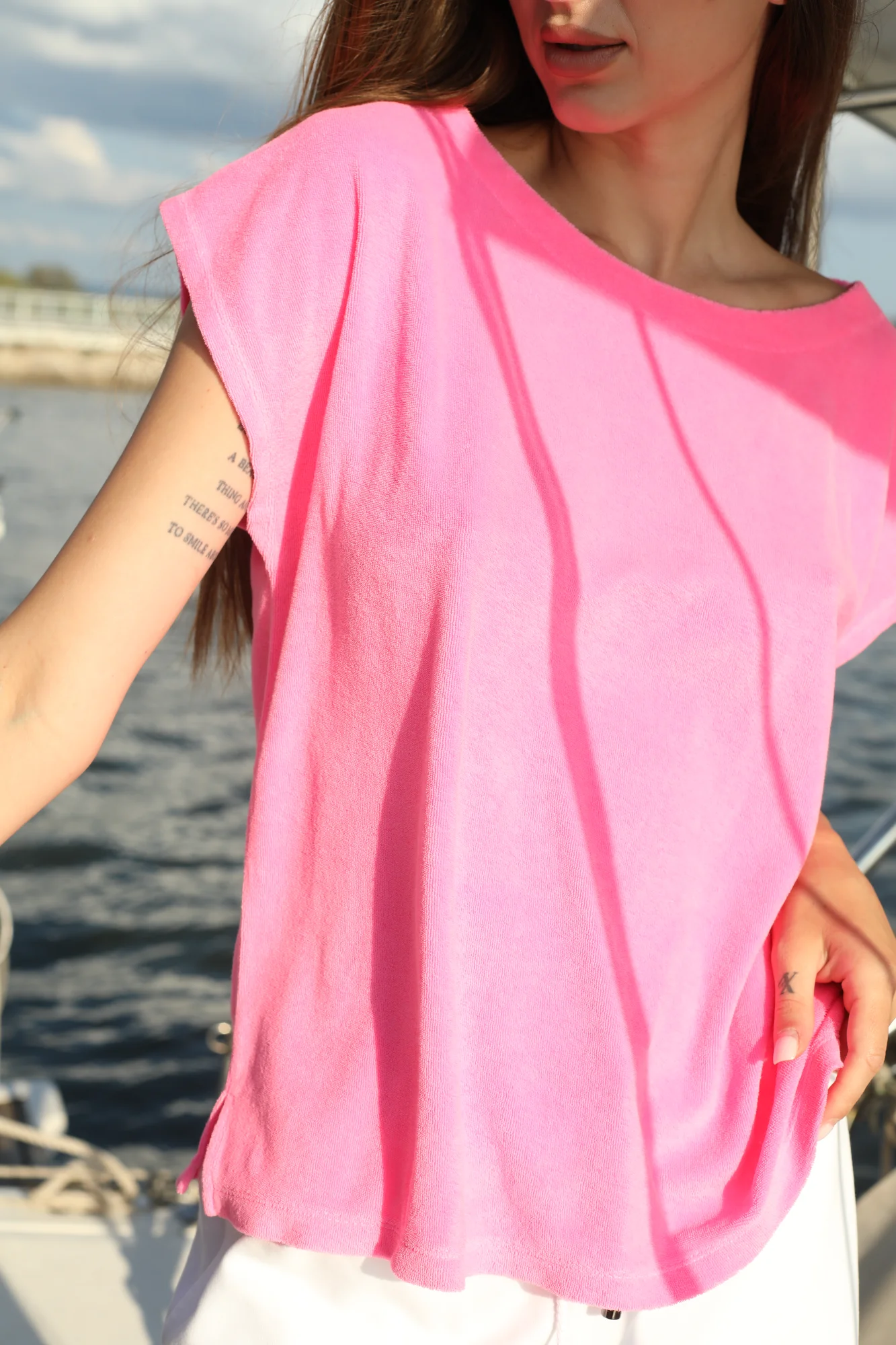 Футболка Juvia из супермягкого легкого махрового флиса с круглым вырезом горловины, заниженной линией плеча, короткими рукавами и боковыми разрезами.