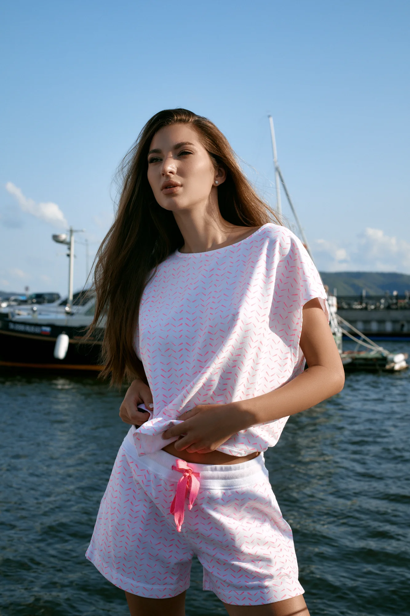 Нежный костюм от Juvia из мягкой хлопковой смеси из футболки и шорт. Футболка свободного силуэта, укороченные шорты с небольшими разрезами — идеальный выбор для комфортного дня.