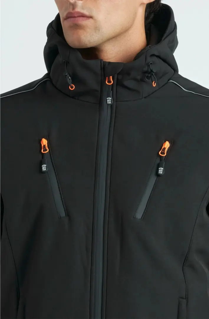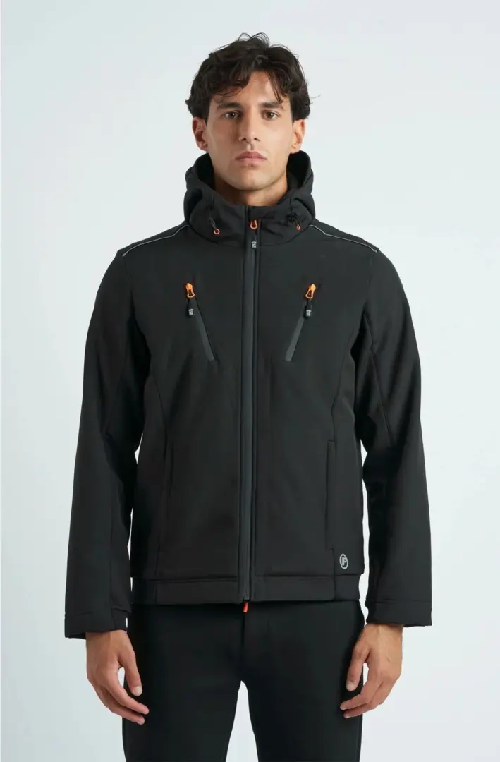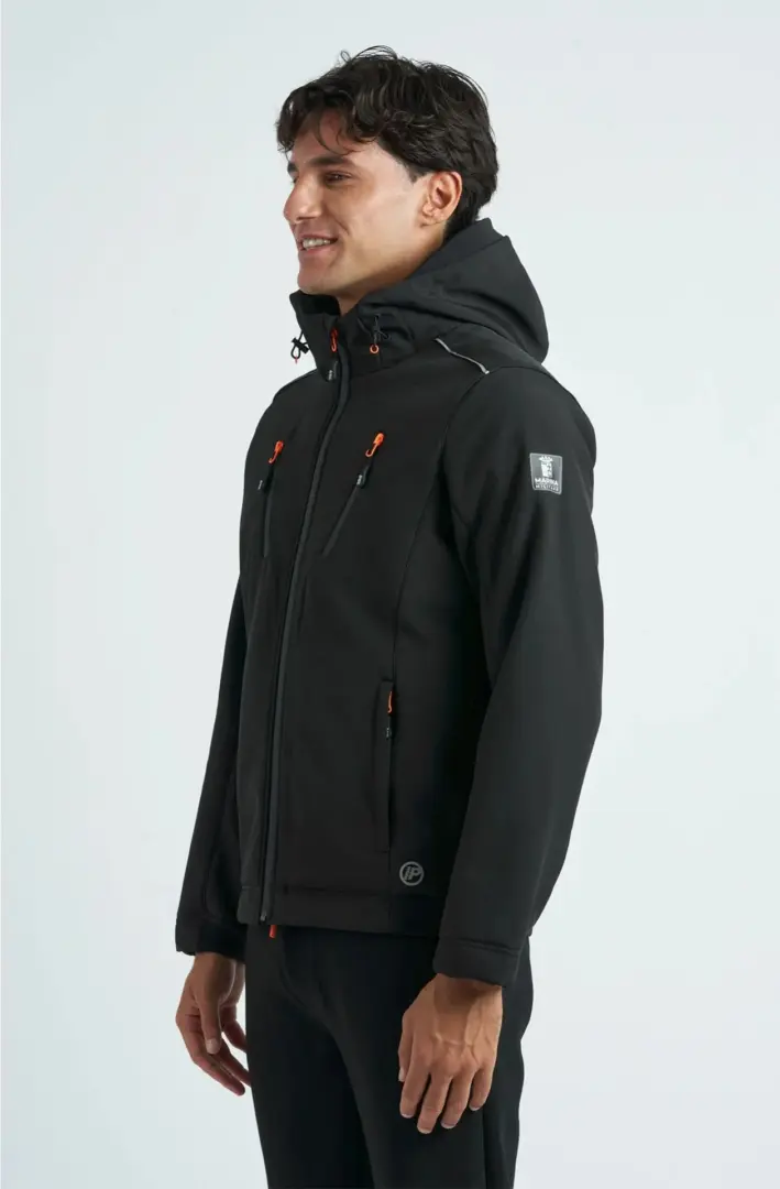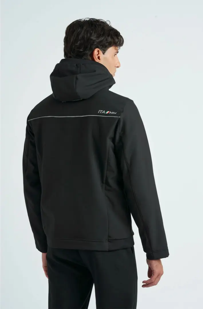 Куртка из софтшелла с флисовой подкладкой, фиксированным капюшоном, эластичным ребристым внутренним воротником, прорезиненной застежкой-молнией с мягким язычком и внутренними карманами. Два нагрудных кармана и два боковых прорезных кармана с мягкими язычками. Эластичные ребристые манжеты и оборка на спине. Прорезиненная нашивка с принтом на левом плече.