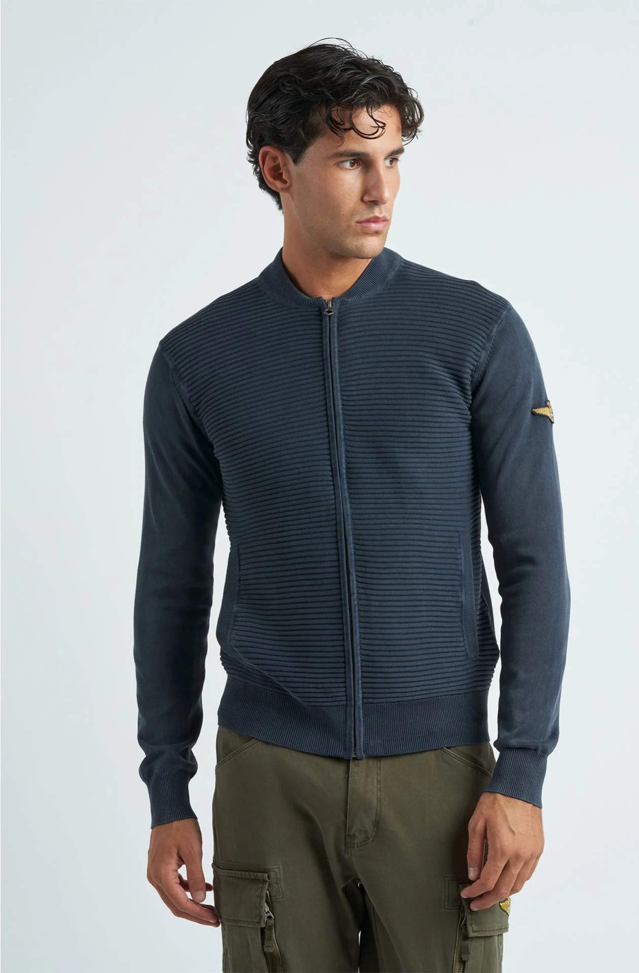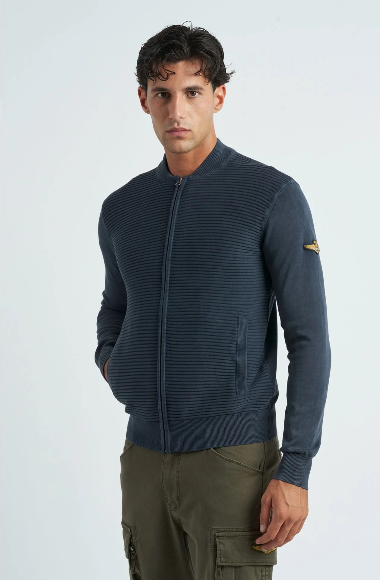 Олимпийка Marina Militare с металлической застежкой-молнией по всей длине и воротником-стойкой. Выполнен в выраженной оттоманской расцветке, рукава однотонной вязки. Открытые карманы. Эластичные ребристые манжеты и боковые оборки. Многоцветная вышитая нашивка на левом плече. Изделие обработано специальной техникой окрашивания. Неравномерность цвета и выцветание во время носки и стирки являются характерными особенностями, а не дефектами. Стирать отдельно и избегать прямых солнечных лучей.