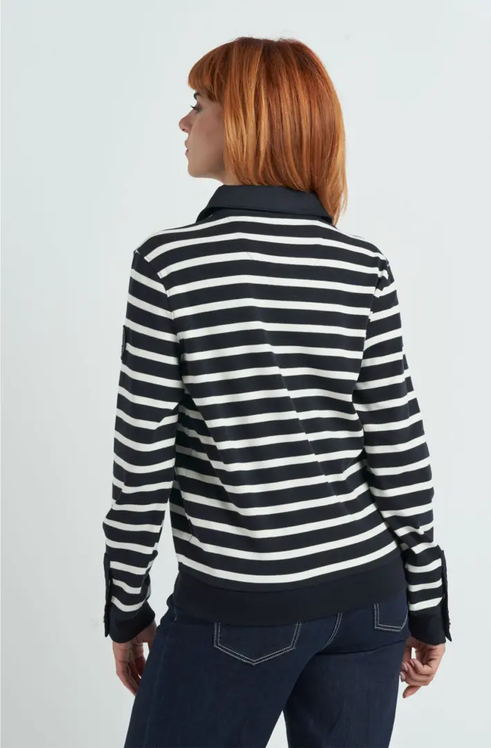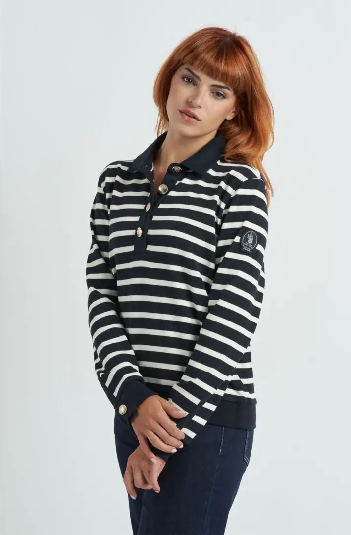 Пуловер с застежкой до середины груди четырьмя золотыми пуговицами, воротником и манжетами из хлопчатобумажной ткани. Эластичные ребристые манжеты и боковые оборки. На левом плече пришита тканевая нашивка с изображением знаменитого парусника.