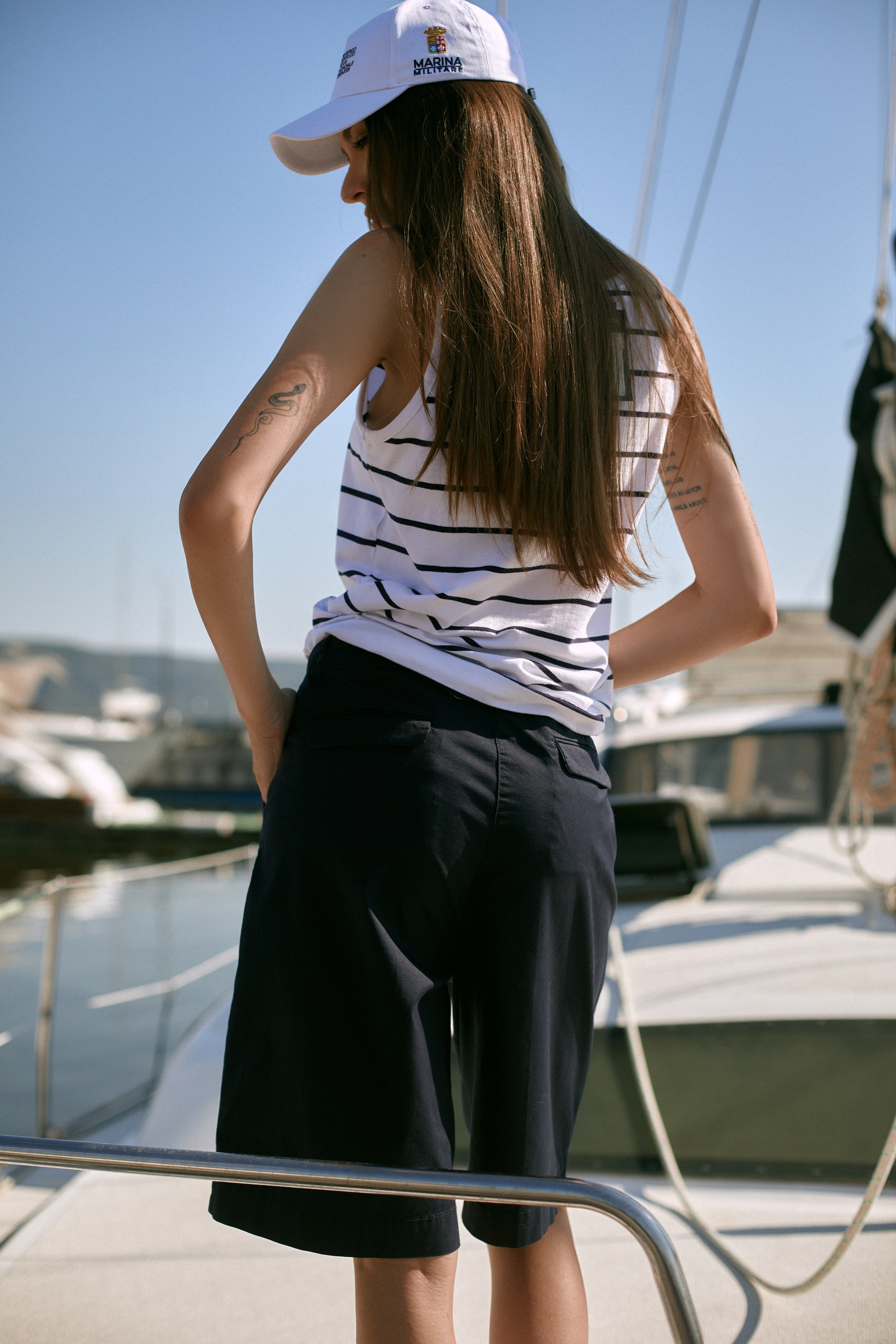 Хлопковые синие шорты Marina Militare — прекрасный выбор для жаркого лета. У шорт застежка-молния и пуговица, карманы, два кармана с клапаном сзади, свободная посадка, которая оставляет свободу для движений.